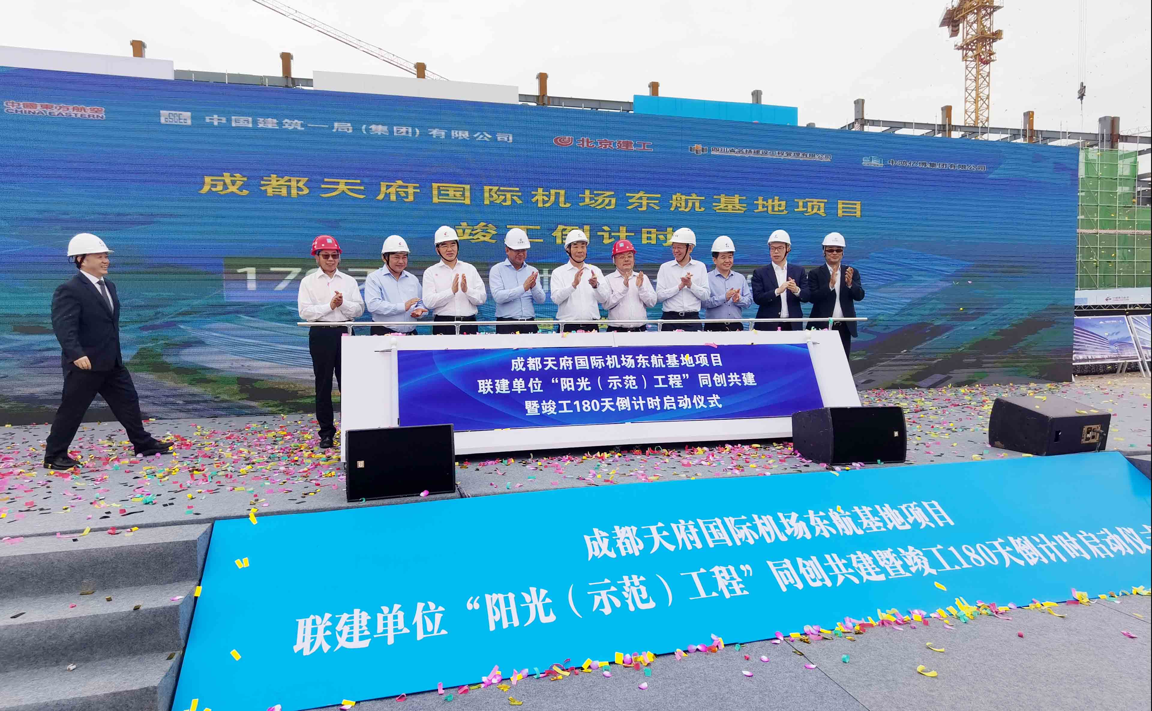 2020年6月3日上午,成都天府国际机场东航基地“阳光工程暨竣工180天倒计时启动仪式”在天府国际机场隆重举行。中国东方航空集团有限公司总经理、党组副书记李养民,副党组成员、副总经理冯德华,党组成员、副总经理席晟,中国东方航空股份有限公司运行总监胡振明等领导参与仪式。集团董事长张敏,总经理何涌泉受邀参加仪式。同时参与启动仪式的还有参加东航基地建设的联建单位中国建筑一局(集团)有限公司董事长、党委书记罗世威。北京建工集团有限责任公司总经理郭明星等。