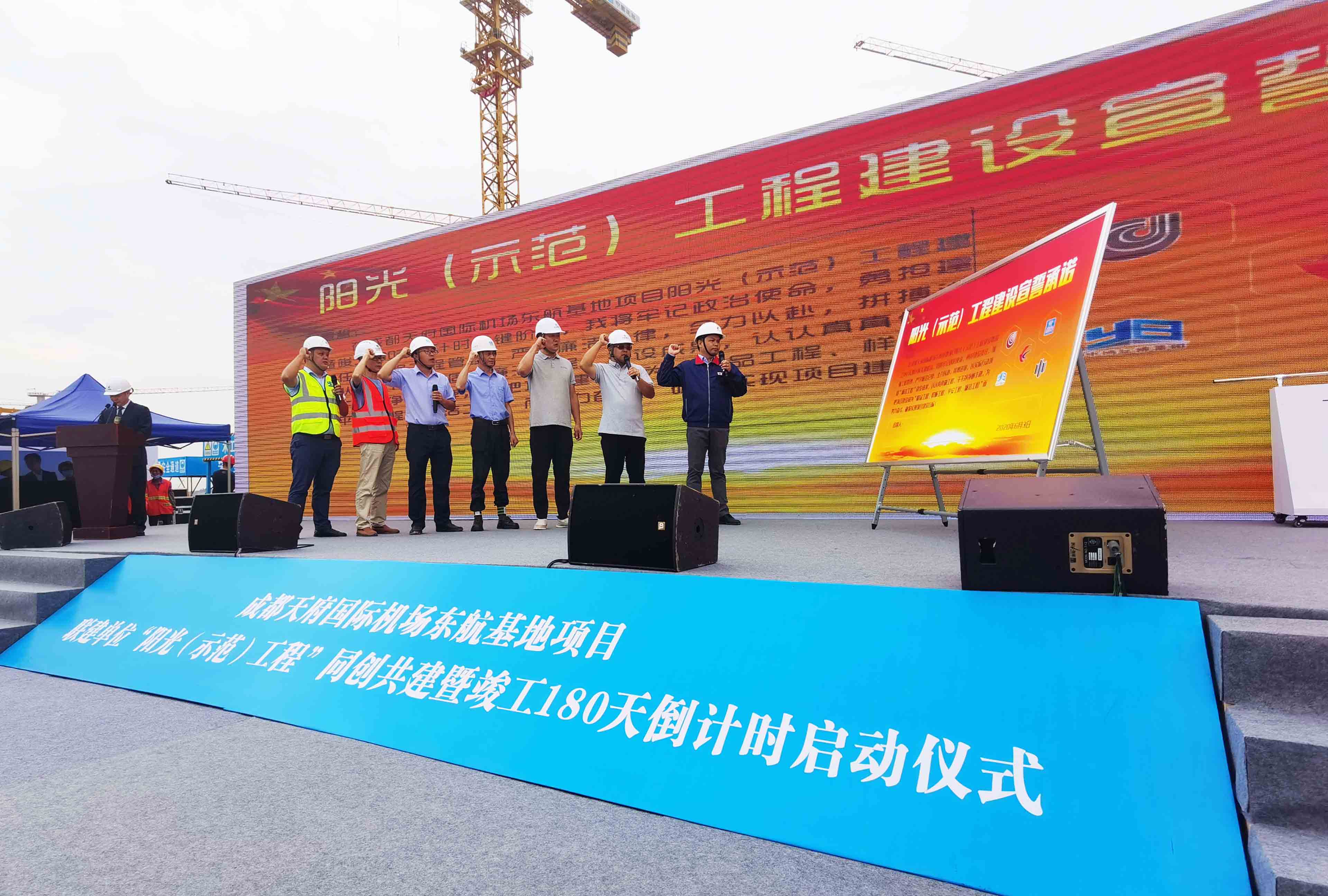 启动仪式由各联建单位代表签署《成都天府国际机场东航基地项目联建单位“阳光(示范)工程”同创共建协议书》。同时各联建单位项目经理(监理单位总监)还举行了郑重宣誓承诺:在成都天府国际机场东航基地项目阳光示范工程,建设暨竣工180天倒计时关键阶段,项目部将牢记政治使命,勇担建设责任,加强工程管理,严守廉洁纪律,全力以赴,拼搏进取,以实际行动巩固廉洁工程建设成果,认认真真做工程,干干净净树丰碑。为把项目建设为“精品工程”、“样板工程”、“平安工程”、“廉洁工程”而努力奋斗。