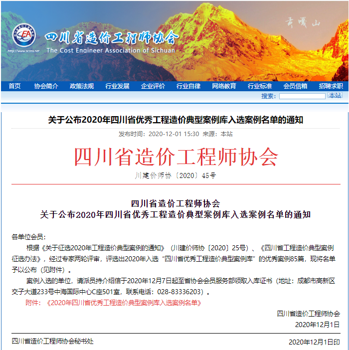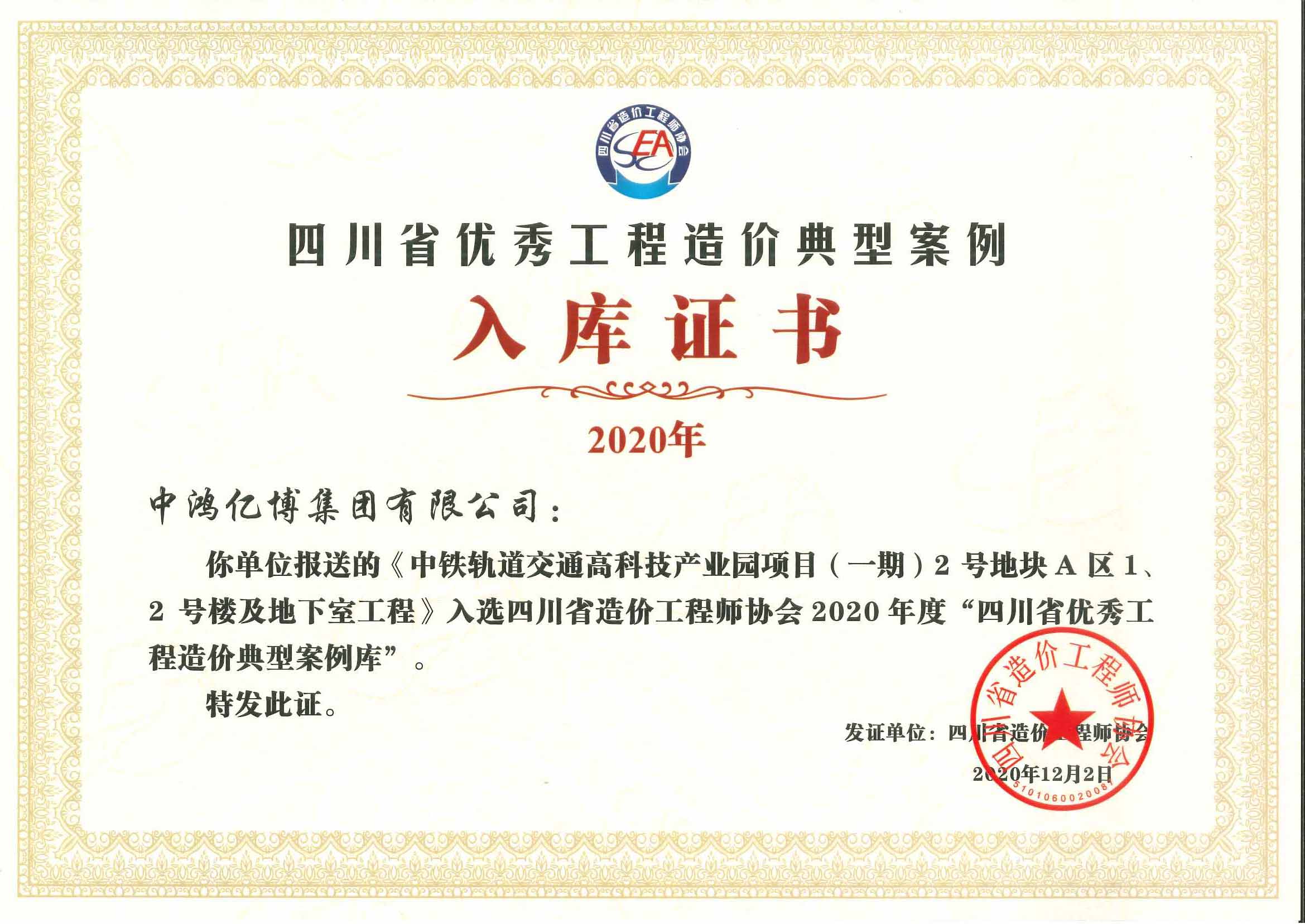 近日,四川省造价工程师协会发布了《关于公布2020年四川省优秀工程造价典型案例库入选案例名单的通知》。根据《关于征选2020年工程造价典型案例的通知》(川建价师协〔2020〕25号)、《四川省工程造价典型案例征选办法》,经过专家两轮评审,中鸿亿博结算审核项目“中铁轨道交通高科技产业园项目(一期)2 号地块A 区1、2 号楼及地下室工程”项目成功入选2020年四川省优秀工程造价典型案例库。