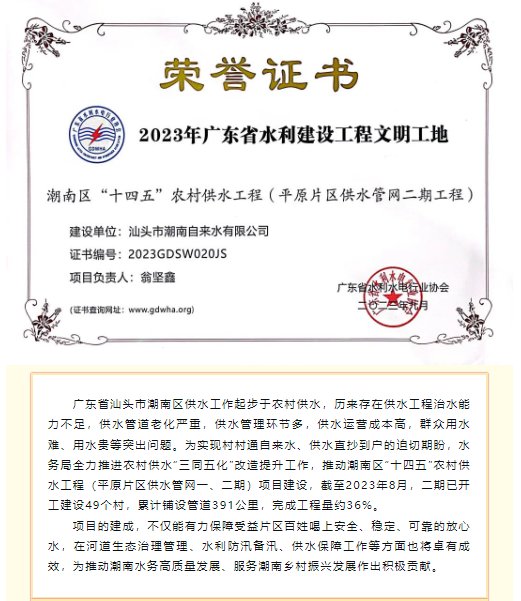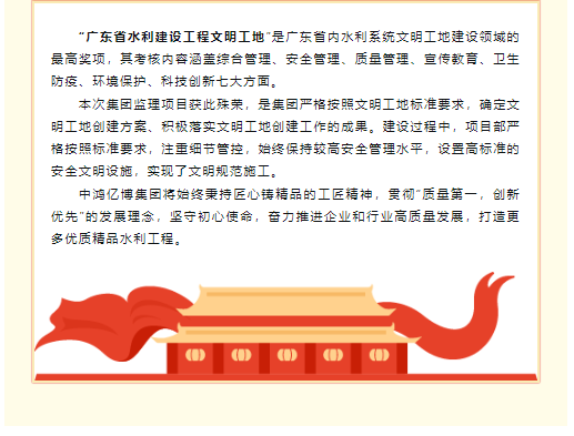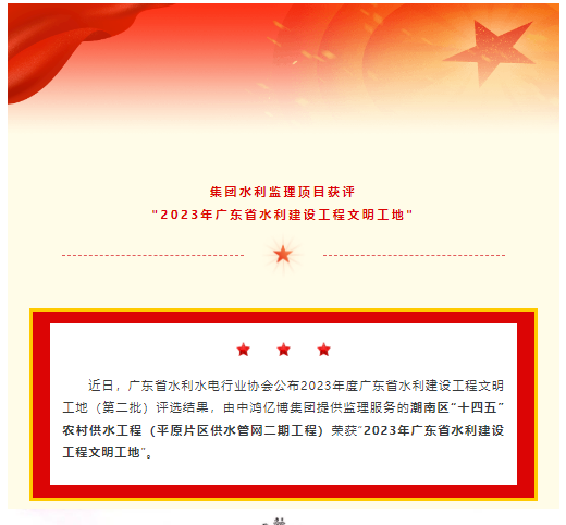 恭喜集团水利监理项目获评“2023年广东省水利建设工程文明工地”