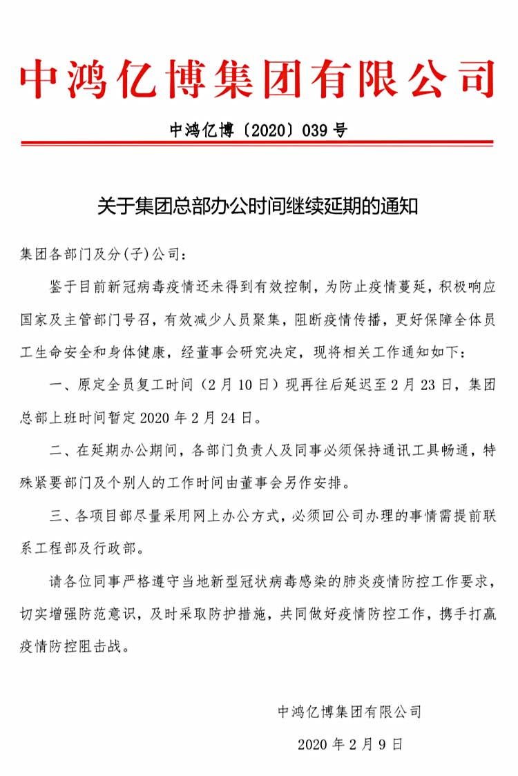 中鸿亿博集团关于集团总部办公时间继续延期的通知