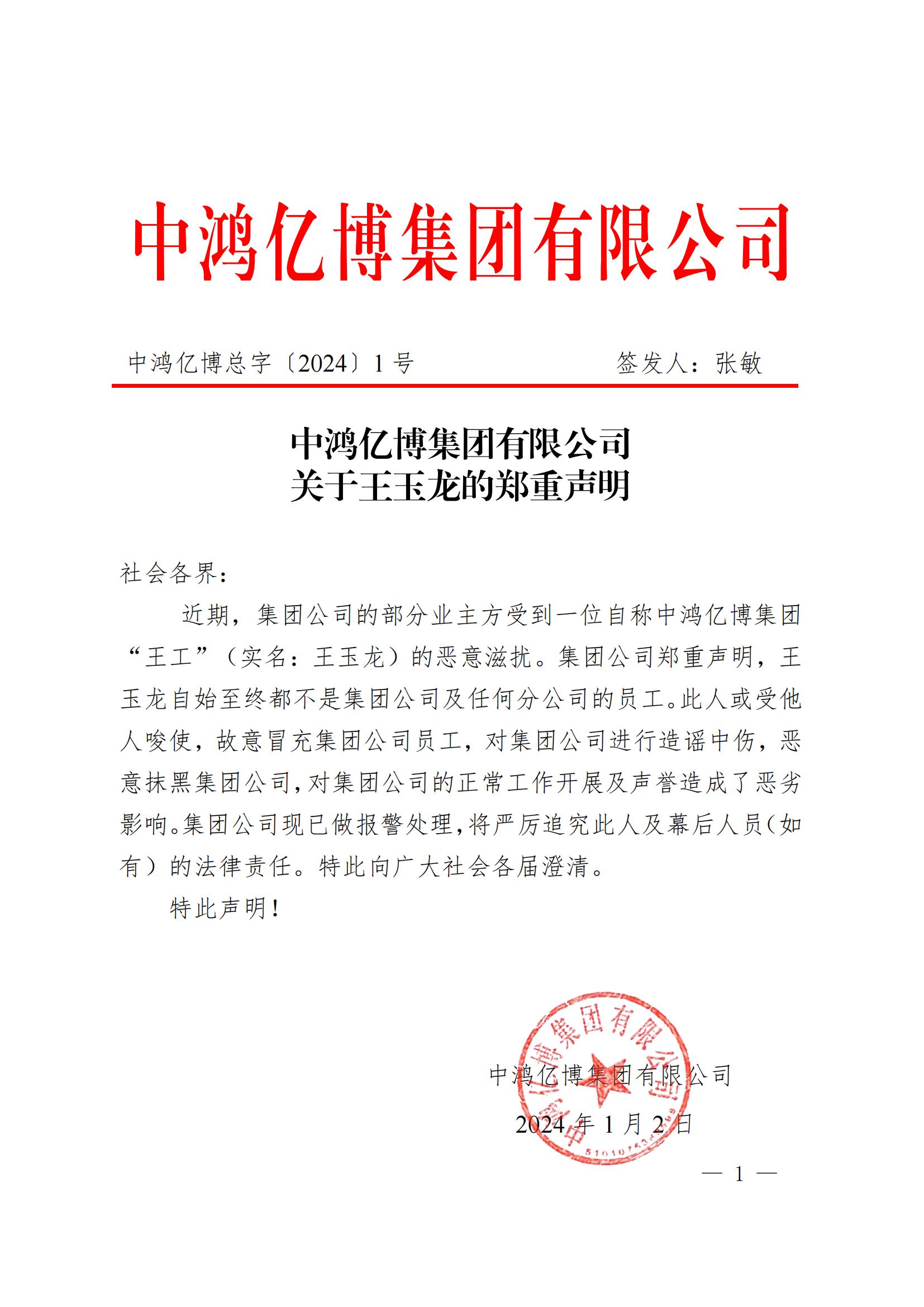 中鸿亿博集团有限公司 关于王玉龙的郑重声明